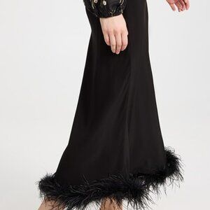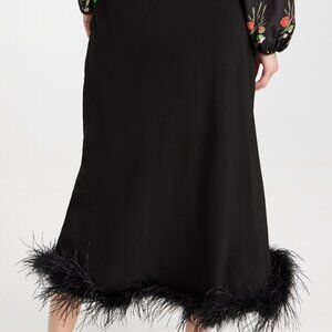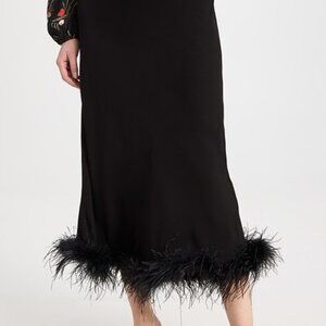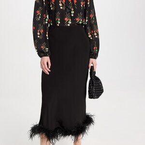 NWT Black Rixo Kelly Feather Trimmed Crepe Midi Skirt. Size Large. Floaty feathers add playful glamour to RIXO's timeless design. This 'Kelly' midi skirt is made from crepe and cut on the bias for a column silhouette that contours your shape. Fabric: Lightweight, non-stretch crepe