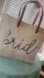 ๐. Beautiful light beige canvas tote with leather handles. Bride has silver sequence in a stylish font.