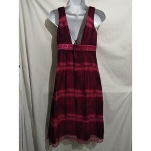 Absolutely gorgeous brand new Bohemian style dress from laundry by Shelli segal in size 2. This dress comes with extra beads just in case. The dress itself is an A-line with an empire waist featuring iridescent Crystal seed bead and tiny delicate sequin details. The dress itself is 100% silk with an acetate lining. The over the shoulder straps also feature the same iridescent seed beads and teeny sequins. The entire dress is in shades of tie dye pink ranging from light to dark. The back features a small decorative tie. The closure for this dress is a hidden side-zip featuring a hook and eye at the top for added support. MSRP for this item is $360. The chest measurement for this dress is about 28-29 inches and the total length is about 42 inches.
