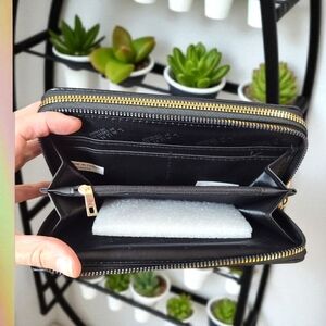 NWT Laundry by Shelli Segal Black Leather Wallet. Gold hardware; 2 zipper closure sections, credit card holders. One zipper section has credit card holders, the other has an inner zip pocket, more credit card holders and open pockets. Organization galore! Measures 7.5"L x 4" H x 1.5" depth.