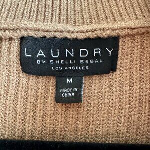 This NWT Laundry by Shelli Segal sweater is a stylish choice for travel or casual wear. It features a striped pattern in brown and white, with a half-zip design for added detail. Made from knit fabric, this long sleeve pullover sweater in size Medium has a regular fit and is machine washable for easy care. Perfect for the fall and spring seasons, this versatile piece from a reputable brand is a great addition to any woman's wardrobe. * Color: Camel / Marshmallow Stripes