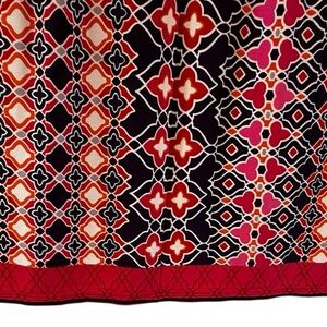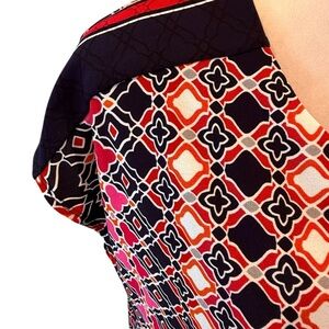 Stylish dress featuring a bold geometric pattern. Dominant colors are red, navy, pink, and orange. Perfect for a chic look.