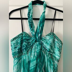 Embrace elegance with this stunning chiffon halter gown, featuring exquisite beading detail. A treasure from Saks Fifth Avenue, this gown has never been worn and is in great condition, save for a minor imperfection as shown in picture 6. Its flowing silhouette and detailed craftsmanship make it a showstopper for any formal event.