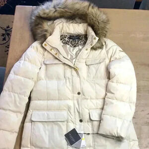 Beautiful winter coat! Ivory colored with faux fur trimmed hood. So soft & warm! Size medium, Laundry.