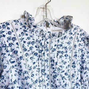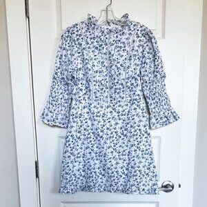 Brand new Laura Ashley x Urban Outfitters Maisy Mini Dress. Features a high neck, smocked three-quarter sleeves, eyelet detail at bodice, seersucker fabrication, interior lining, dainty floral motif, and ruffle detail at neck, cuffs and hem. Color: White/Blue. Size: Large (Runs Small). Bust: 19" Pit-to-pit. Length: 33" Shoulder-to-hem. Material: 100% Cotton (Shell), 100% Rayon (Lining). Excellent condition. Never worn. New with tags.