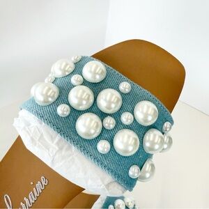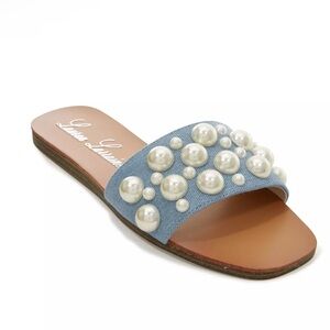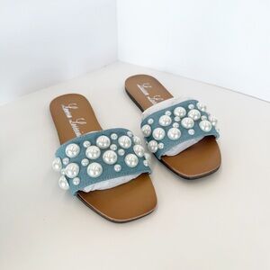 NWT Lauren Lorraine Nilo Pearl Denim Slides. Elevate your summer style with these Nilo Sparkling Slide On Flat Sandals by Lauren Larraine. These sandals are perfect for any occasion, whether it's a day out shopping or a beach party. The lightweight design and slip-on closure make them easy to wear and comfortable for all-day use. Featuring a beautiful blue denim upper material and pearl detailing, these sandals are both stylish and fashionable. The flat style ensures that you can walk around comfortably. These sandals are a must-have for any woman's shoe collection. Size 6.