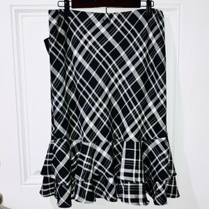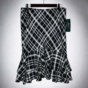 NWT Lauren Ralph Lauren Black White Plaid Side Wrap Ruffled Hem Midi Skirt Sz M