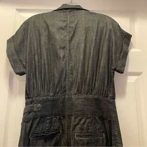 The jumpsuit is made of 100% cotton denim material with a heather pattern in the Nightfall Wash color. It features a collared neckline, dolman cuff sleeves, and a straight leg style. The jumpsuit has a zip fly with a hook-and-bar/button closure and buckle accents. It also has pockets for convenience. This one-piece jumpsuit is machine washable and is available in size 4 for regular fit. Perfect for summer, fall, and spring, this jumpsuit is a great addition to any wardrobe.