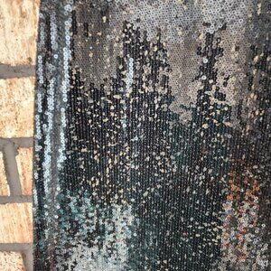 This Lauren Ralph Lauren v neck dress features soft sequins, raised waist with faux side tie, and thigh slit. Black and brown sequins combine to give the fabric a soft tortoise shell hue. Fully lined.