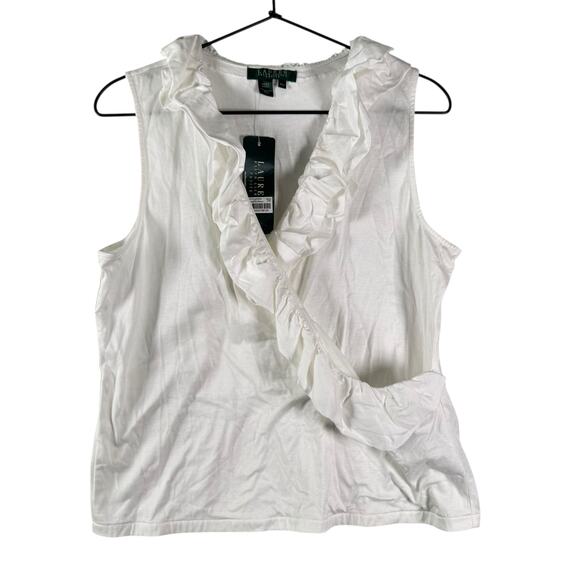 NWT Lauren Ralph Lauren Ruffled White Faux Wrap Tank Top V-Neck Casual Size PL