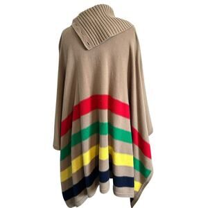 Crafted from a warm wool blend this turtleneck poncho is characterized by authentic equestrian details like a blanket-stripe motif and horn-effect buttons embellished with gold-tone horse heads. Oversized fit. 48% Wool, 23% Nylon, 15% Cotton, 14% Lambswool. MSRP $245.