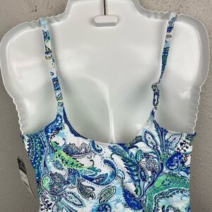 Super cute blue and white paisley design on this two-piece swim suit.