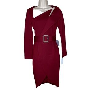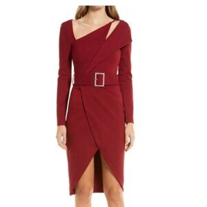 Lavish Alice Asymmetric Long Sleeve Midi Dress in Burgundy features a cutout, asymmetric neckline, long sleeves, fitted silhouette, gem embellished belt buckle, wrap skirt with front slit.