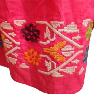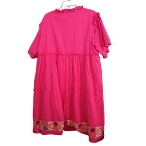 Add a bold pop of color to your wardrobe with this vibrant pink dress by Layerz Clothing, size XL. Featuring a flattering tiered silhouette with ruffle details, this dress is crafted from 100% cotton for breathable comfort. The hem is beautifully accented with colorful embroidered floral and geometric designs, giving it a playful and unique touch. Button-front neckline with included extra button. Fully lined with 100% polyester for added coverage.