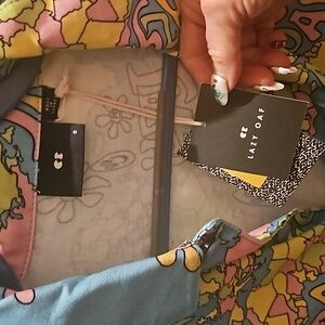 NWT Lazy Oaf button down non-gendered jacket, oversized small, blue, pink yellow, iconic geographic, happy faces, Lazy Oaf graphics, 100% cotton, branded buttons, love this just no occasion to wear it.