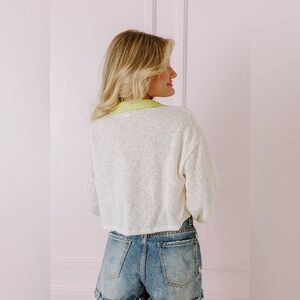 Lightweight green and cream knit material – V-cut collared neckline – Three button front closure – Double chest flap pockets – Long, loose sleeves with button closure cuffs – Flattering silhouette that ends in a straight hemline.