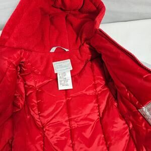 This is a vintage, NWT, winter jacket for a baby, 12M size. It is red, gray, and blue, and features a cute little teddy bear on the left chest. there are matching mittens that clip onto the jacket so they don't get lost. The jacket has a fleece-lined hood, but it doesn't have a drawstring. The front pockets are actually double pockets, as there are hook-and-loop pockets under the open pockets on each side of the front of the jacket.
