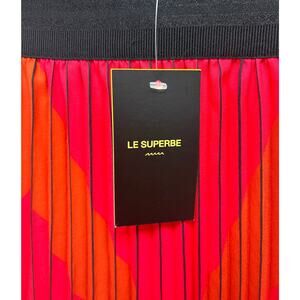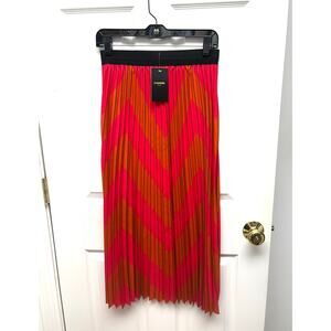 This acordion pleated skirt from Le Superb is a red and rusty orange chevron print. Black pin stripes run down the folds and it slips on with an elastic waist. The size medium skirt is new with tags.