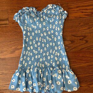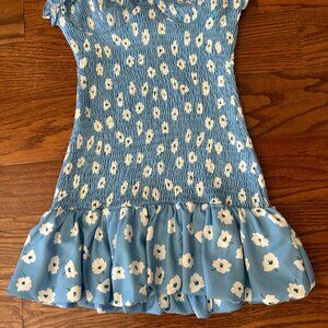 NWT LeLe Floral Ruffle Mini Dress Blue Size Medium Sweetheart Neckline Smocked