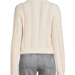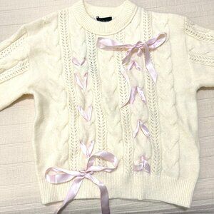 A classic cable knit sweater with an ultra-feminine twist. This pullover features a ribbon detail at the front and slouchy dropped shoulders.
