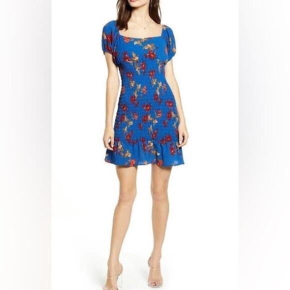 NWT Leith Smocked Square Neck Short Sleeve Mini Dress Blue Floral Size Medium
