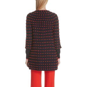 Elevate your wardrobe with this stunning Lela Rose cardigan featuring cherry-red textured crochet dots for a chic, playful finish. Designed with a relaxed, oversized fit, this standout sweater blends vintage charm with contemporary elegance.