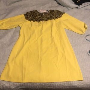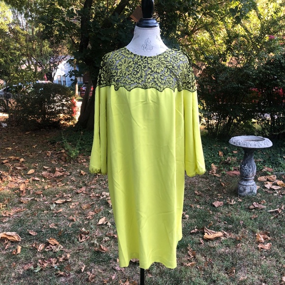 New with tags Lela Rose for Lane Bryant swing dress Plus size 22. The pics taken outside show the color more accurately. I would say it is more of a Citrine (yellow leaning a little toward a touch of green tinge, but not quite lime). It is a very bright color. The sleeves are 3/4 length. This dress is super comfy and has such a designer look to it. It has a button at the top of the neck in the back and a zipper down the back. There is a small pick on the front a little below where the waist would be, as shown in the photo, it is pretty minimal, but I wanted to document it. The lace around the chest is such a special detail, especially the way it is color coordinated with the dress.