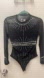 Elegant black bodysuit featuring stunning pearl embellishments. Long sleeves and sheer details add sophistication. The Rhinestones Shimmer Like The Colors Of The Rainbow. NWT. High Neck Collar With Rhinestones. Sleeves Have Rhinestones. Size Small. Sheer. Will Look Beautiful With A Lace Bralette Underneath. Measures 16’ PTP. Length From Shoulder To Snaps 26.5’.