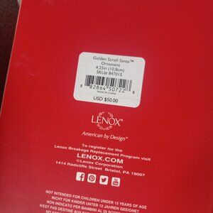 Never been open and brand new Lenox 4.25 decorative ornament made of ivory-colored porcelain with 24-karat gold accents. Design features a Santa Claus figure and has a "Golden Scroll" theme. Some versions belong to Lenox's "Annual Santa-Ornament" line, which was discontinued and was available from 2000 to 2021. Perfect for your Christmas Tree or creative decor, ornament accent to a wrapped present or house warming gift!