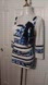 Elevate your wardrobe with this elegant floral striped sweater blouse with a bow laced through collar and embellished with blue rhiinside flowers. This white and blue design offers a sophisticated look for any occasion.