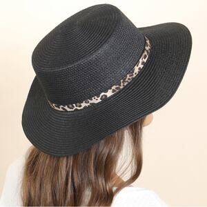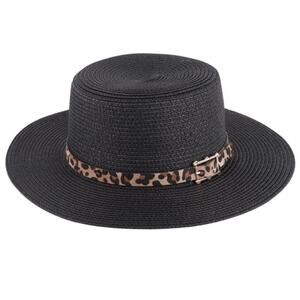 Panama Brim Hat with Leopard Buckle Accent. Perfect for spring and summer. Cute leopard detailing. One size fits most. Circumference 24”, crown height 3.75”, width 14”