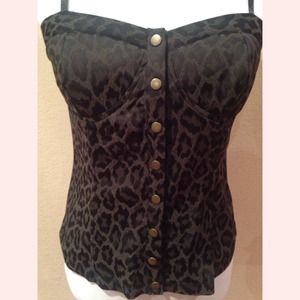 NWT. Fitted woven leopard print top. Button down. Black straps. Polyester/Spandex.
