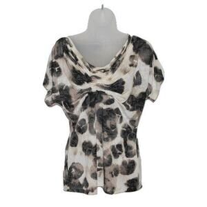 Short sleeve summer top by Inc International Concepts in muted watercolor leopard print against an antique white with flattering gathered bodice pleat. Made of lightweight, wrinkle-resistant Poly/Rayon blend. Machine washable; follow sewn in care instructions.
