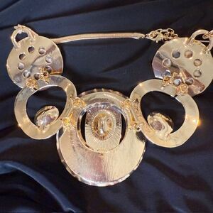 NWT Leopard and Gold Tone Statement Necklace and Earring Set Circles Wild. Brand New! See photos for details and measurements. Beautiful Gold Tone Statement Necklace with gold rings and Leopard print enamel and gold tone crystals. Gold Tone Circular Earrings.