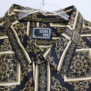 Level Ten Baroque Shirt Mens M, Black, Gold Button-up- Modern Fi; Y2K, Baroque. Tuck front; wear to club & date night.