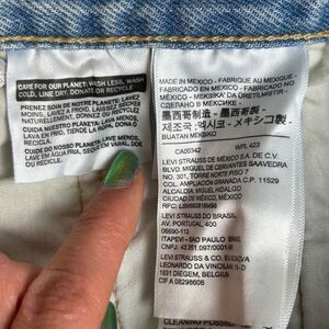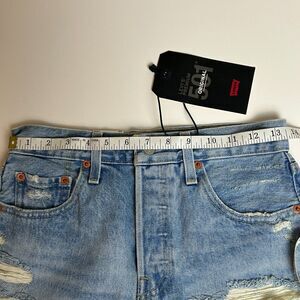 Brand new with tags Levi's 501 original fit women's shorts in Fault Line, a light to medium blue shade with tons of distressed details. Levi's original 501 denim shorts have waist defining high rise, cut off style bottoms, and intentional distressed holes and fringe detail on both legs for a festival or concert ready look. Button front, 5 pocket design, Levi's logo patch and tab on back, vintage inspired fit. 100% cotton. NWT. Women's size 25 or US 0 - measurements pictured.