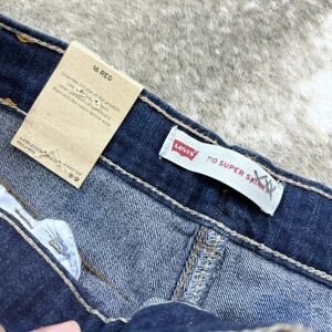 Here’s a brand new with tags pair of jeans by Levi’s. Size 16. Great shape, one small factory distressing on the leg of one as shown. Perfect Super Skinny jeans style. Great for everyday wear. :)