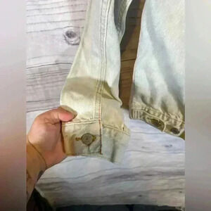 This Levi's denim jacket is a trendy addition to your wardrobe. The floral embroidered design adds a touch of retro and American classic to your outfit. It features a button closure, point collar, and oversized fit with a bodywarmer for all seasons. The mid-length jacket is made of cotton denim material and is machine washable. It has pockets to keep your essentials safe and is perfect for casual occasions. The jacket is available in size M and is unlined. The jacket is perfect for those who love the 90s retro style and want to add a touch of modernity to their wardrobe.