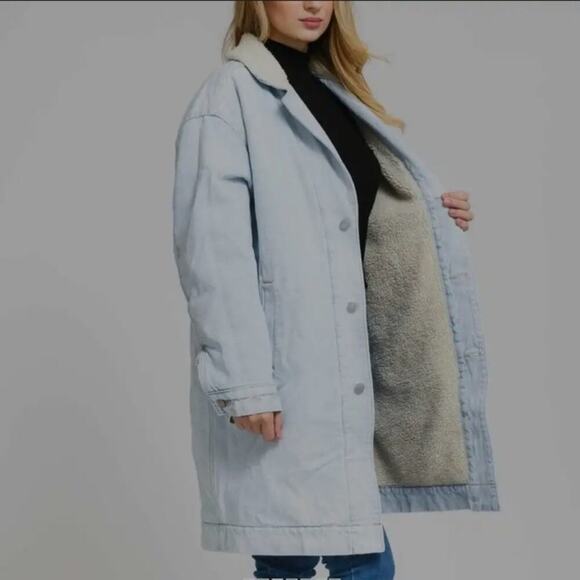 NWT Levi's Reversible Light Wash Denim Sherpa Long Line Heavy Coat Size S.