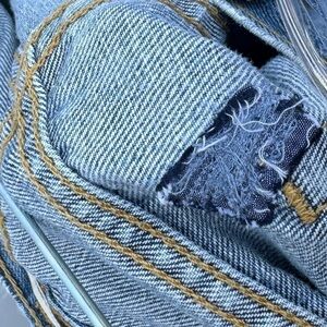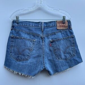 Repaired vintage Levi’s shorts, raw hem, cut off style, zipper fly, may have some markings—intentional as these are “repaired vintage”. Has repaired back hole—please see photos for details. They were sold like that.