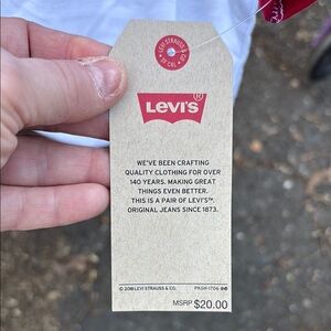 New with tags Levi’s white short sleeves tee is boys size 5 S 4-5 Years. The tee is trimmed in red. The graphic design on front is in red and blue. It says Levi Strauss & Co. San Francisco Cal. Original Riveted Quality Clothing Patented May 20 1873. Made in Egypt of 100% cotton. Armpit to armpit is 13” across front. Shoulder to hem is 17” long. There is a red tag on side of tee.