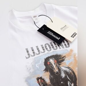 JJJJound x Levi’s men's regular fit white T-Shirt. The T-Shirt draws inspiration from 90s grunge aesthetics. Crafted from 100% cotton, it showcases a striking screen-printed graphic of two horses on the front. Offered in a washed light shade, this shirt features the classic J90 fit, making it a versatile and effortlessly wearable addition to your wardrobe.