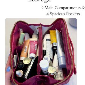 ✅【Unique Design Makeup Bag】It’s sophisticated design, featuring PU lining both outside and inside, keeps your beauty essentials organized. Inside there are two main compartments with two small pockets on one side- where lipstick or any other small accessories can easily fit. One zippered pocket in the middle, separating the two main compartments, perfectly fits brushes and makeup pencils. Another zippered pocket is on the other side of the cosmetic bag. This bag allow you to separate your makeup items, skincare products, and toiletries, making it easy to find what you need quickly.
