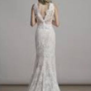 The material of the gown is Corded Chantilly. Color is Ivory/Creme with low cut V-Neck. The dress has a very attractive train with covered buttons that run from the top of the zipper to the bottom of the dress. Measurements- Bust 36, Waist 28, Hip 38, Length from the top of the front shoulder to the bottom hem is 62 inches.