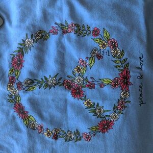Vibrant blue tank with floral peace sign, says peace & love. NWT Life Is Good crusher tank top women's size small.