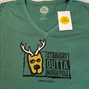 NWT, Life Is Good, green tee with a quirky reindeer design. Features 'Straight Outta North Pole' text.