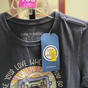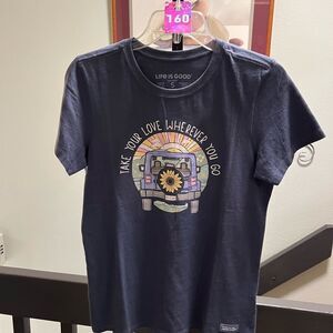 brand new with tags attached. This Life is Good t-shirt features a fun graphic design on a navy background. Perfect for everyday wear, it combines comfort with style. length 24”, pit to pit 19”. From a smoke free 🏠