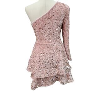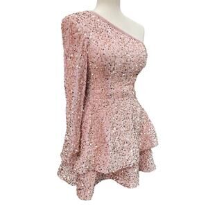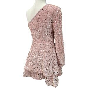 NWT Light Pink Asymmetric One Long Sleeve Short Sequin Dress