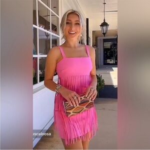 Swaying fringe lends free-spirited animation to an event-ready mini dress detailed with glinting hardware on the straps.