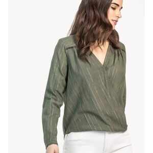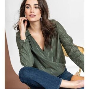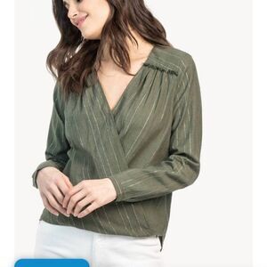 Brand New with Tags, NWT Lilla P Crossfront Green and Metallic Silver Top with Fringe in size small.